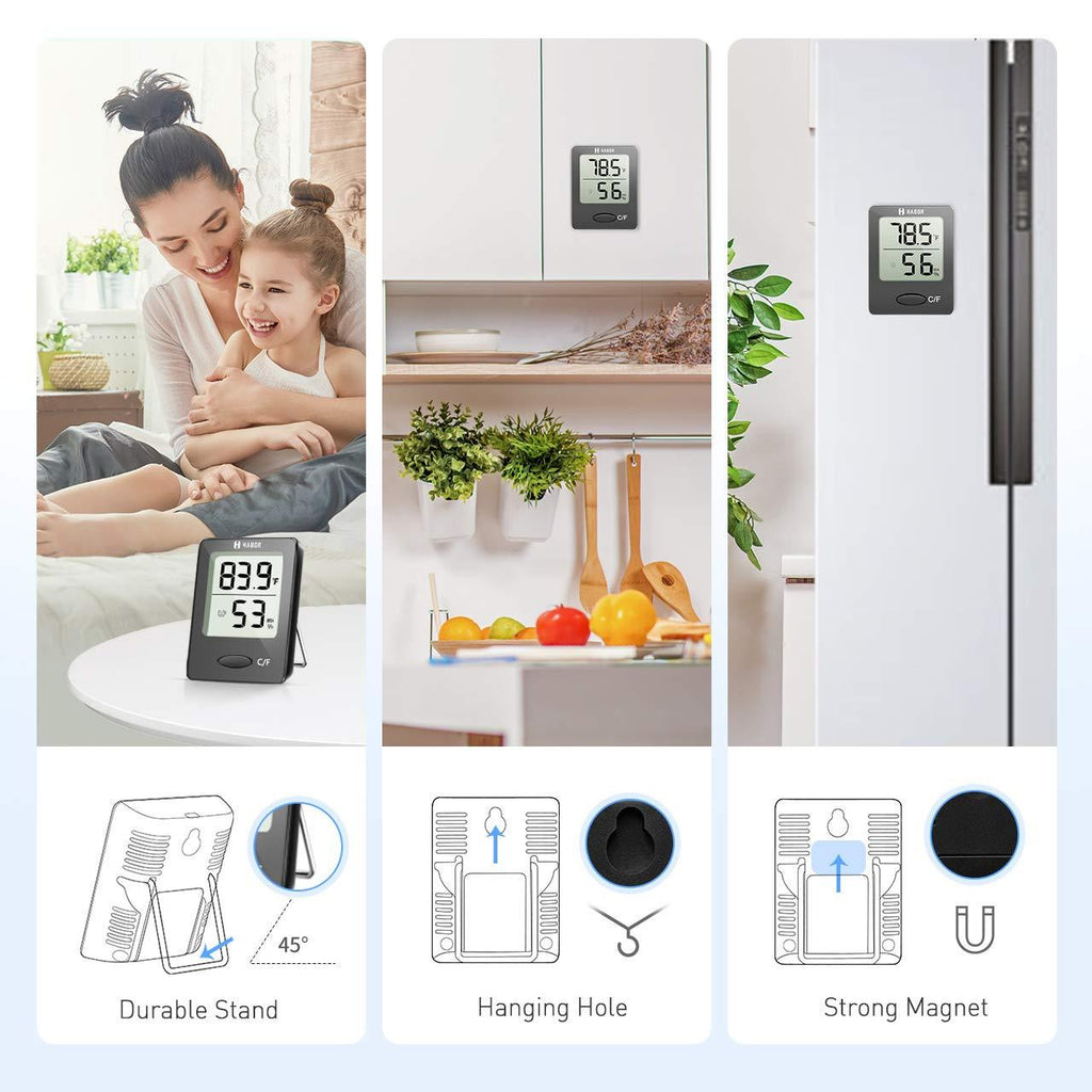 • 【Multiple Mounting humidity gauge room thermometer with magnet attaching, table standing, and wall hanging design, put anywhere you want, convenient mounting feature for every type of room like kitchen, garden, greenhouse, basement, baby room, guitar room and office.