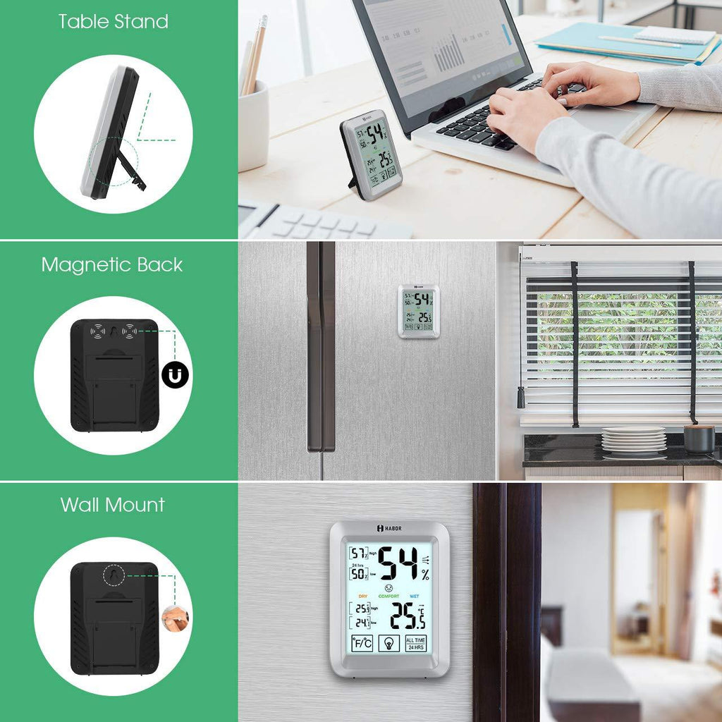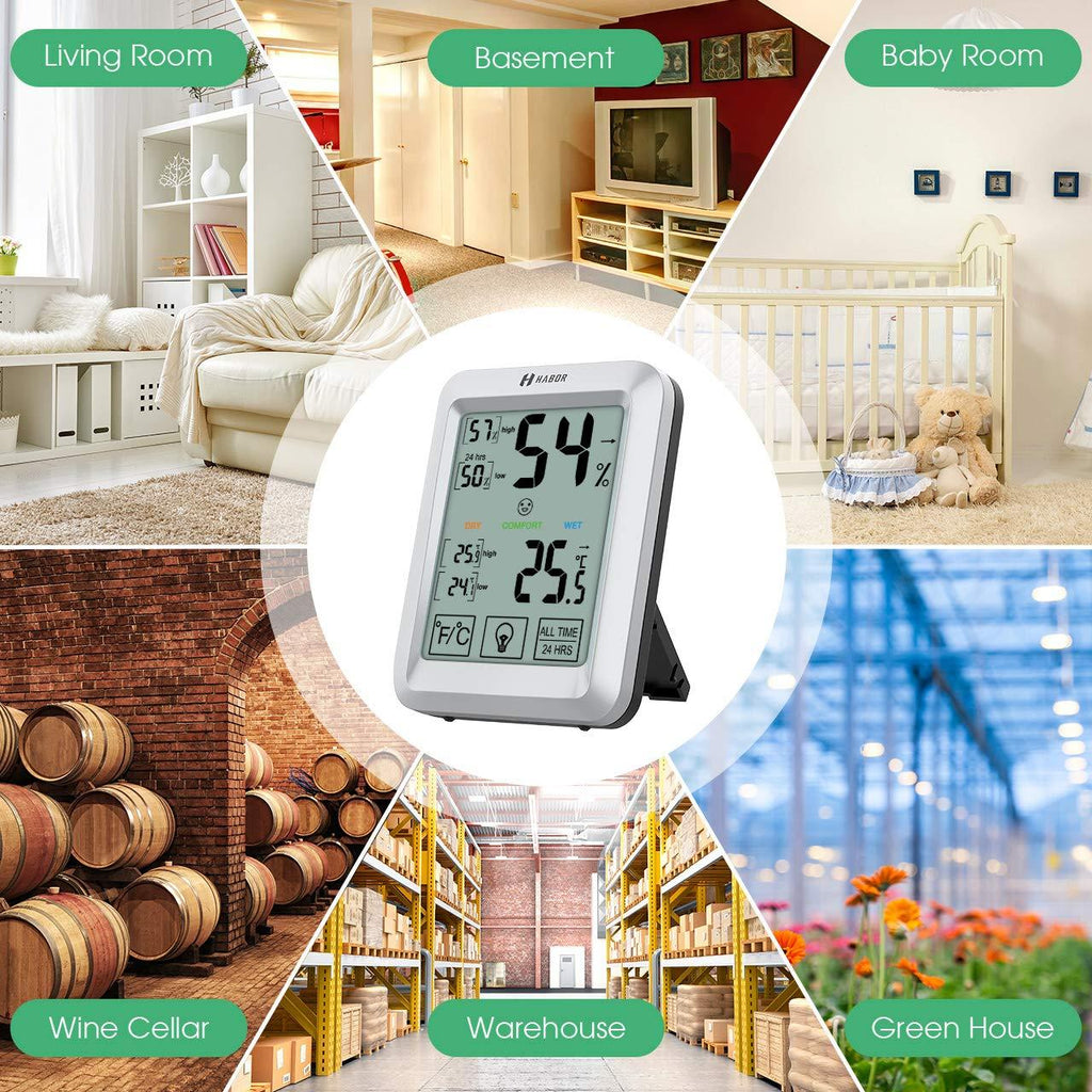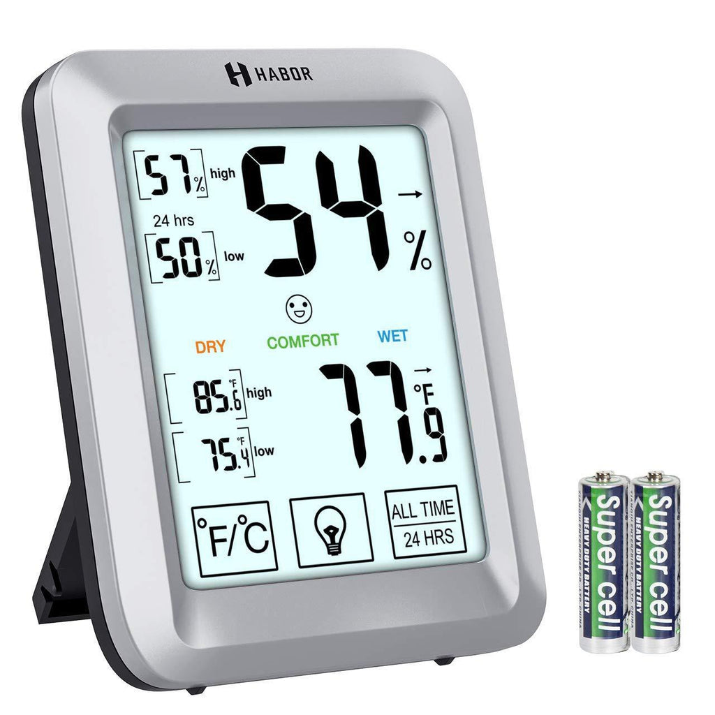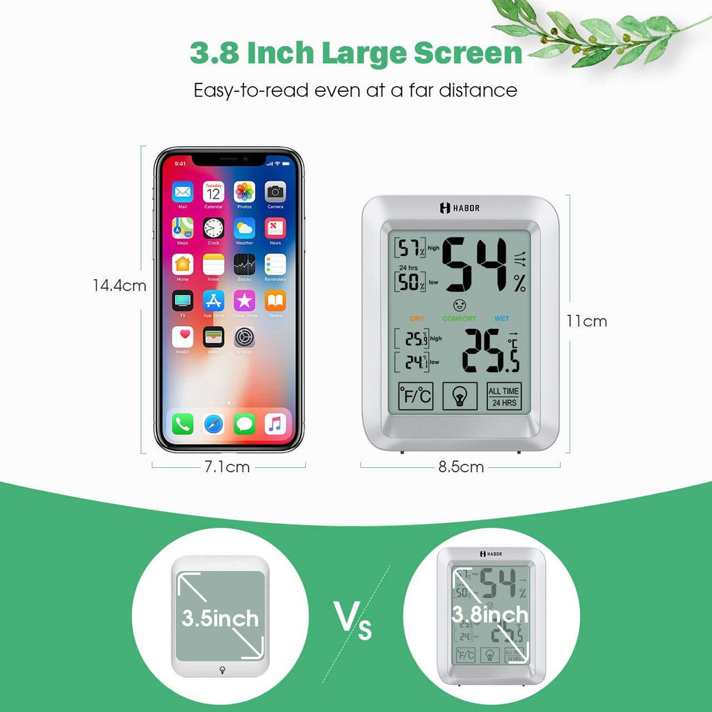 - 【Backlight Large LCD Screen】Habor Upgraded hygrometer thermometer (3. 5-inch large screen), 50% of which is taken up by big digits showing temperature and humidity, offer much clearer display even at a distance. Easy touch-control for switchable temperature unit, 10s bright lighting and temperature hygrometer trend records (2 X AAA Batteries Included).