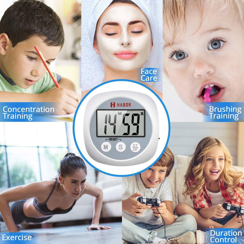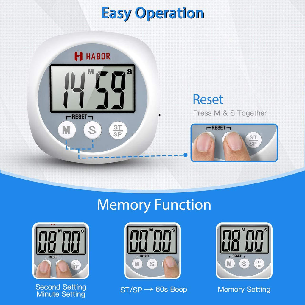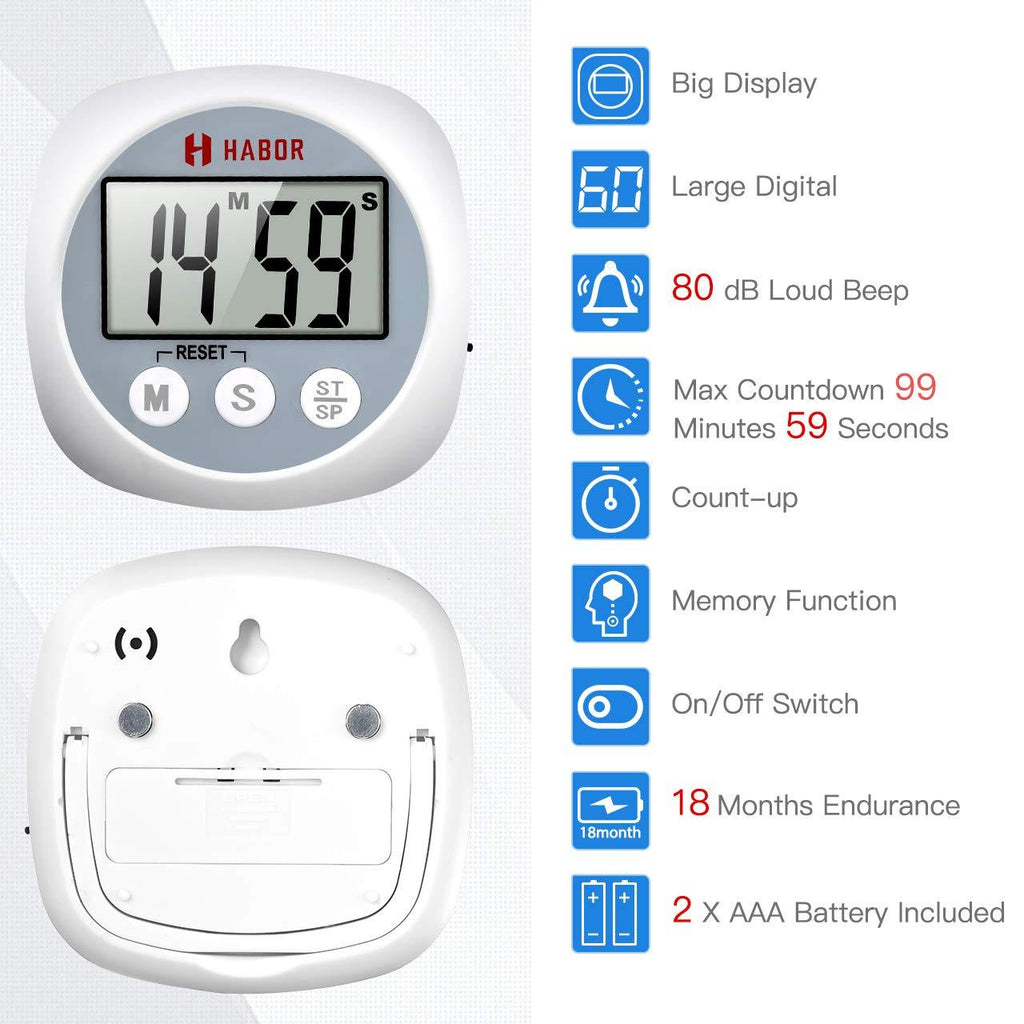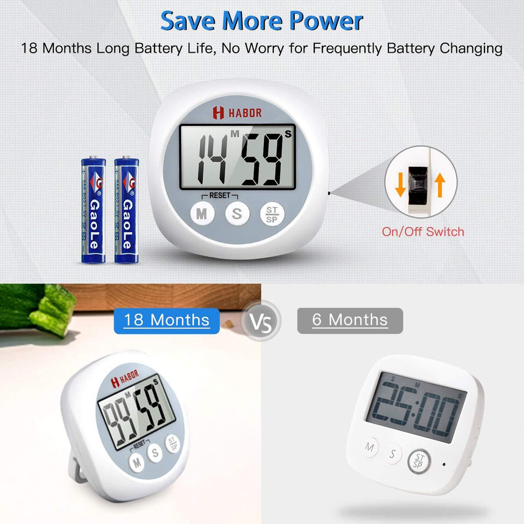 • 【Large Display Digits & 18 Months Endurance】Habor kitchen timer with a 2 x 1.2 inches clear display and large digits which is easy to read even when the timer is out of reach. On/off switch will save more power, you can turn it off when you aren't using it. Maximum 18 months long battery life, no worry for frequently battery replacement.