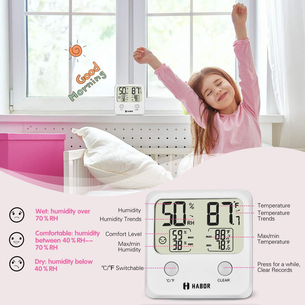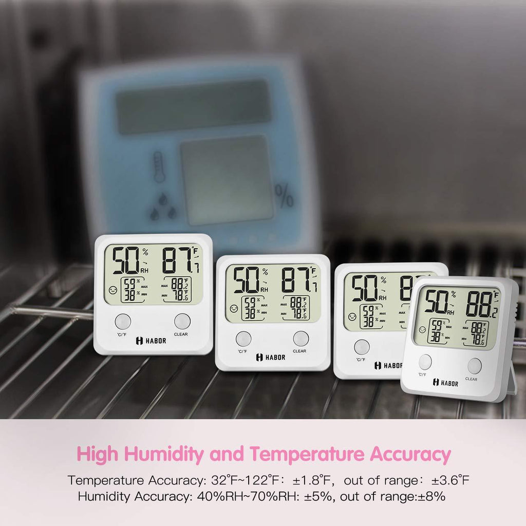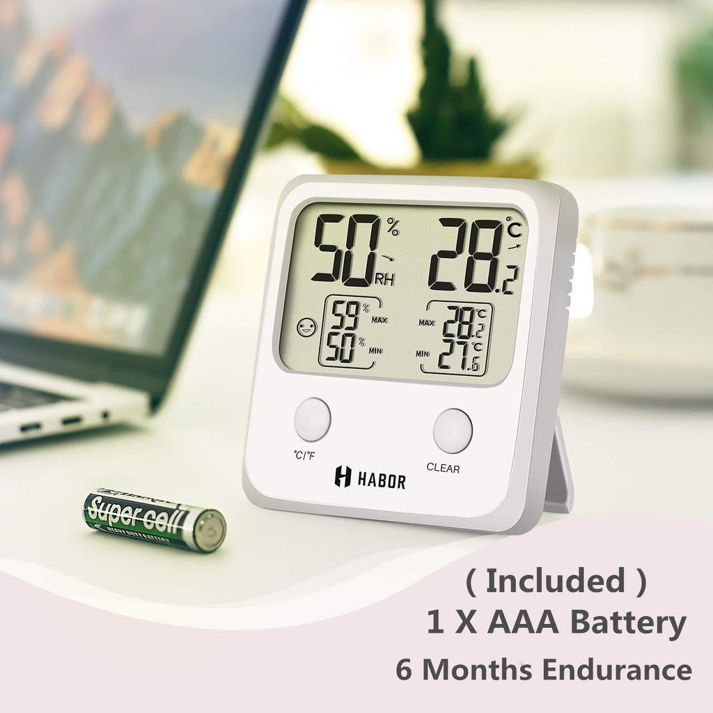 Details: Professional Accuracy and Easy Reading Characterized by high resolution and professional design, the new temperature and humidity gauge is more accurate for monitoring air quality. Measurement data is refreshed every 10 seconds so that you have no worry to miss the current temperature and humidity. Big digits on the screen also contribute to your easy reading of the air condition. Must-have For Indoor The thermometer provides reliable information of indoor to protect you from disease. Indoor humidity levels that are too high can lead to an increase in home pollutants, such as mold, bacteria, viruses, fungi, and dust mites. Humidity levels that are too low can cause nosebleeds, skin irritation, difficulty breathing and static electricity. Better air quality can be achieved if you have this helpful monitor. Specification Temperature Range: 14℉~122℉(-10℃~50℃) Humidity Range: 10%RH~95%RH Temperature Accuracy: 0℃~50℃: ±1℃, out of range: ±2% Humidity Accuracy: 40%RH~70%RH: ±5%, out of range: ±8%RH Battery: 1*AAA battery (included) Dimensions: 3. 62" x 3. 54" x0. 87" Note Please replace the battery if the LCD screen stopped working. Please clean the product regularly and do not use it near water. Warranty Every Habor product provides a 45-day money back guarantee and 18-month warranty.