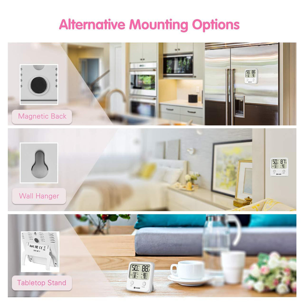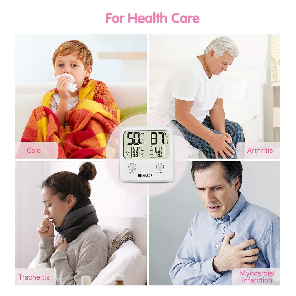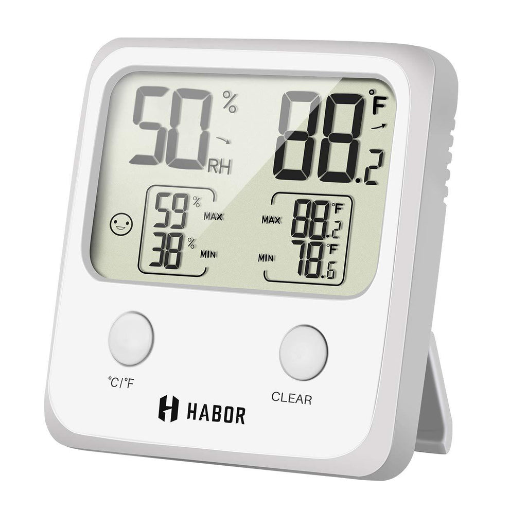 Details: Professional Accuracy and Easy Reading Characterized by high resolution and professional design, the new temperature and humidity gauge is more accurate for monitoring air quality. Measurement data is refreshed every 10 seconds so that you have no worry to miss the current temperature and humidity. Big digits on the screen also contribute to your easy reading of the air condition. Must-have For Indoor The thermometer provides reliable information of indoor to protect you from disease. Indoor humidity levels that are too high can lead to an increase in home pollutants, such as mold, bacteria, viruses, fungi, and dust mites. Humidity levels that are too low can cause nosebleeds, skin irritation, difficulty breathing and static electricity. Better air quality can be achieved if you have this helpful monitor. Specification Temperature Range: 14℉~122℉(-10℃~50℃) Humidity Range: 10%RH~95%RH Temperature Accuracy: 0℃~50℃: ±1℃, out of range: ±2% Humidity Accuracy: 40%RH~70%RH: ±5%, out of range: ±8%RH Battery: 1*AAA battery (included) Dimensions: 3. 62" x 3. 54" x0. 87" Note Please replace the battery if the LCD screen stopped working. Please clean the product regularly and do not use it near water. Warranty Every Habor product provides a 45-day money back guarantee and 18-month warranty.