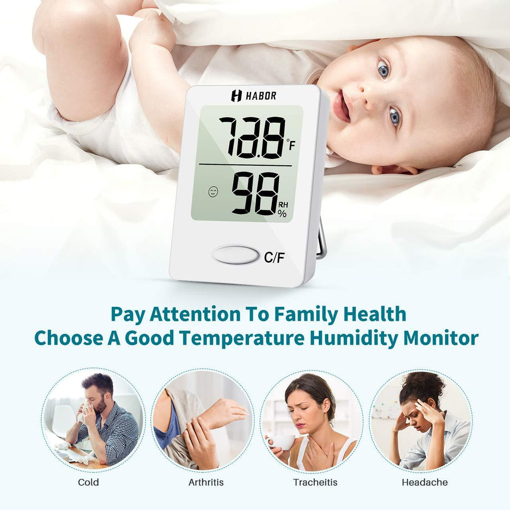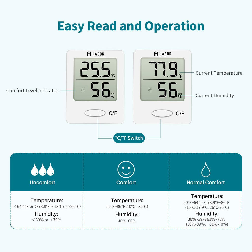 【Comfort Level Indicator】Level icons indicate comfortable, uncomfortable and normal conditions. Habor hygrometer thermometer measures indoor humidity and indoor temperature in time help to adjust the humidifier, dehumidifier settings and humidistat, great for monitoring family's living conditions and health by preventing colds, dry skin, asthma, allergy, mold.