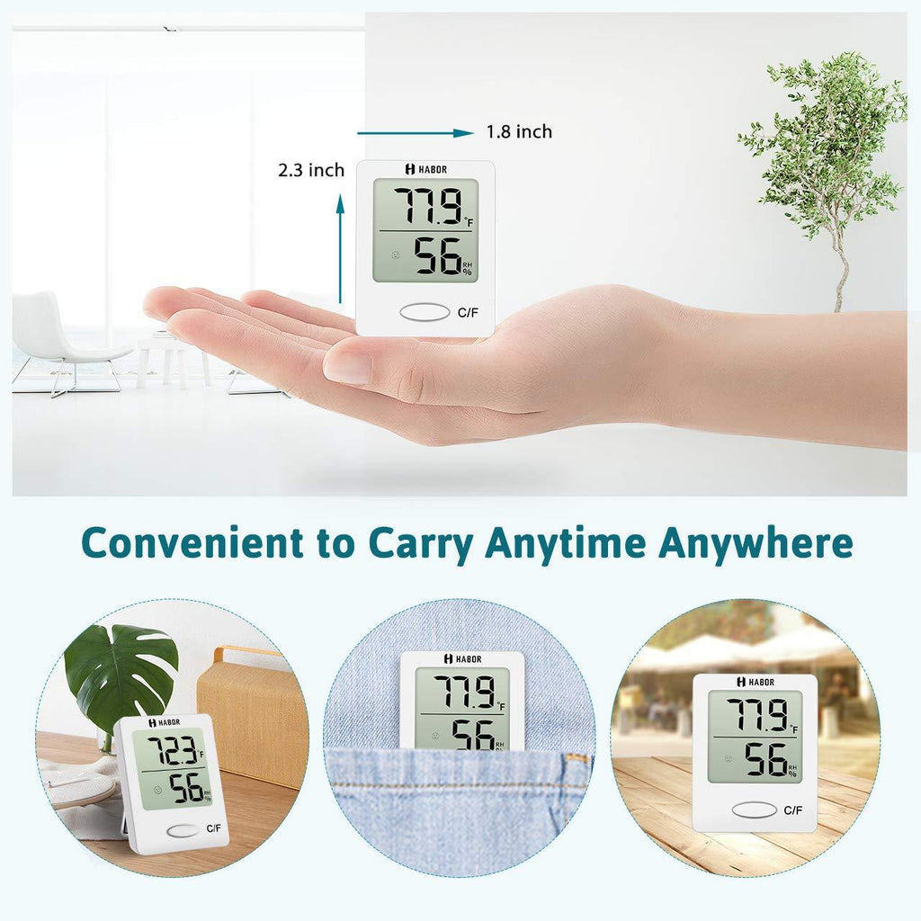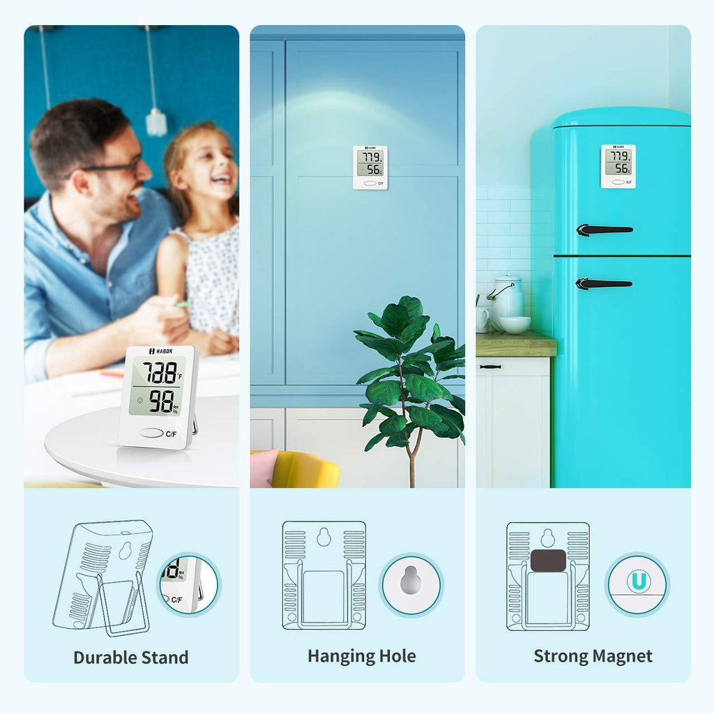 【Multiple Mounting Options】Habor humidity gauge room thermometer with magnet attaching, table standing, and wall hanging design, put anywhere you want, convenient mounting feature for every type of room like kitchen, garden, greenhouse, basement, baby room, guitar room and office.