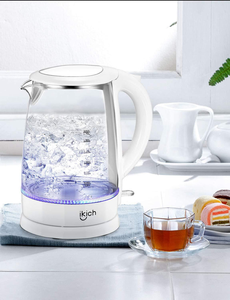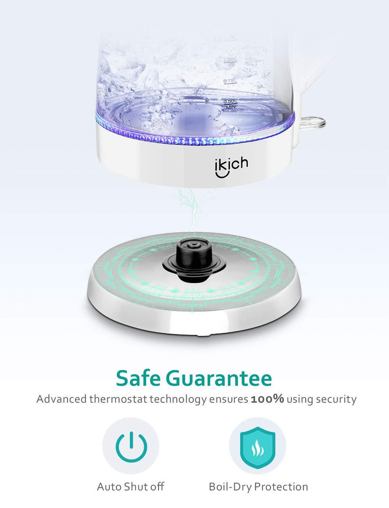 • 【Energy-saving & auto shut-off】With 1500-Watts power,1.7L capacity glass electric kettle provides 8 glasses of water and 1L water rapidly just 4 minutes. the glass electric kettle is faster than a stove or microwave and using less than half the energy. The auto shut-off mechanism activates within a few seconds after the water is fully boiling.