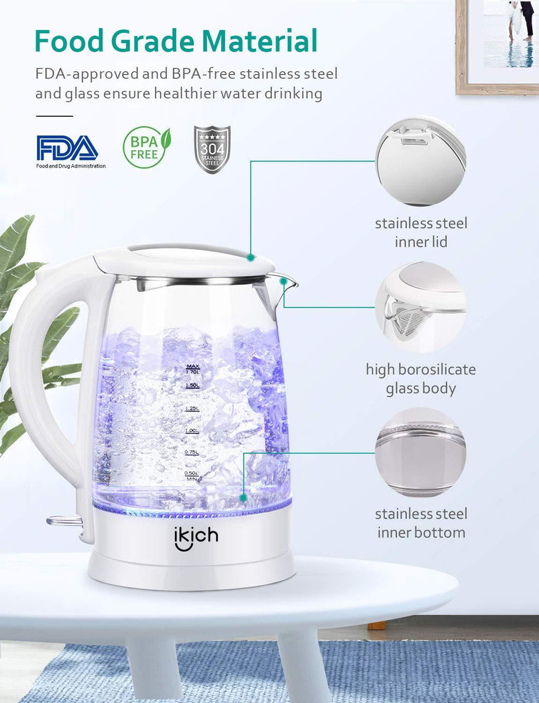 • 【Glass & Steel Lid】Made with high-quality glass,and the hot plate, the lid of kettle are 100% food grade stainless steel, without plastic,preventing taste contamination,which provide you a healthier life. NOTE: The electric kettle's filter made of BPA-free materials. (the same as baby bottles are made of)