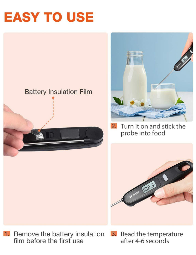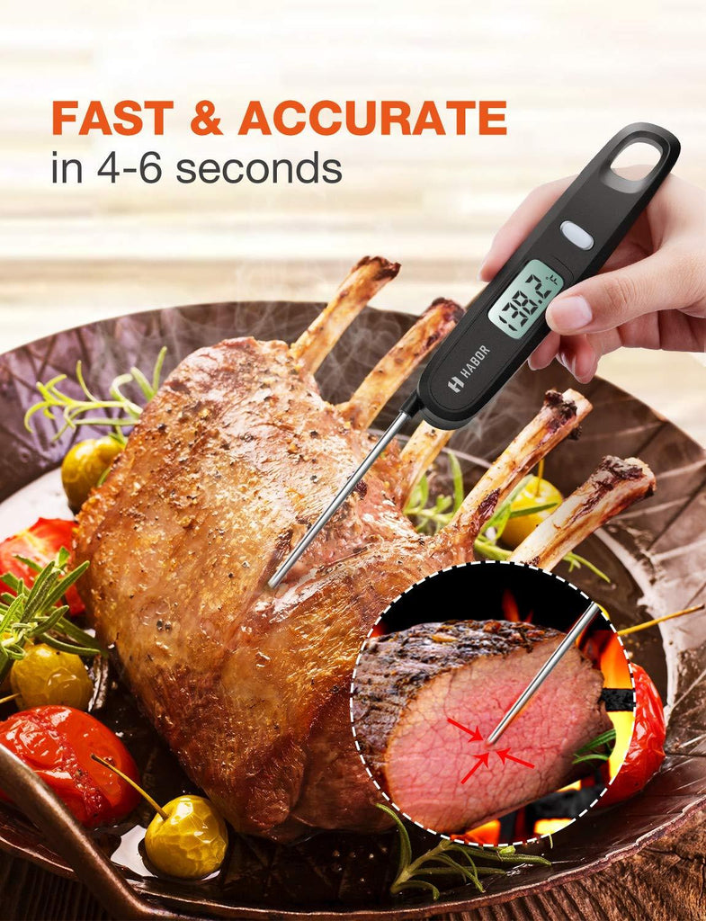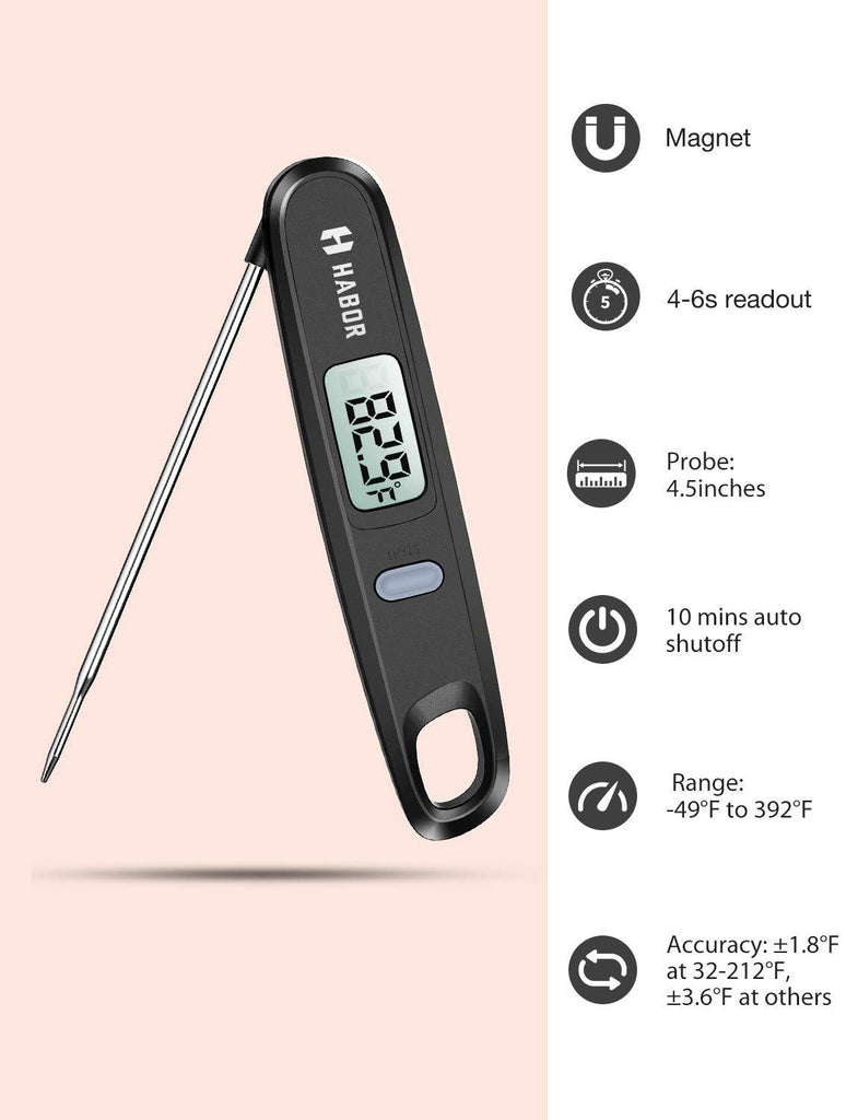 • 【FAST & ACCURATE】Habor FDA-Approval Instant Read thermometer displays temp faster and more accurate, LCD display shows accurate temperature results in 4-6 seconds. Accurate to 1.8°F with a wide range of -49°F to 392°F,