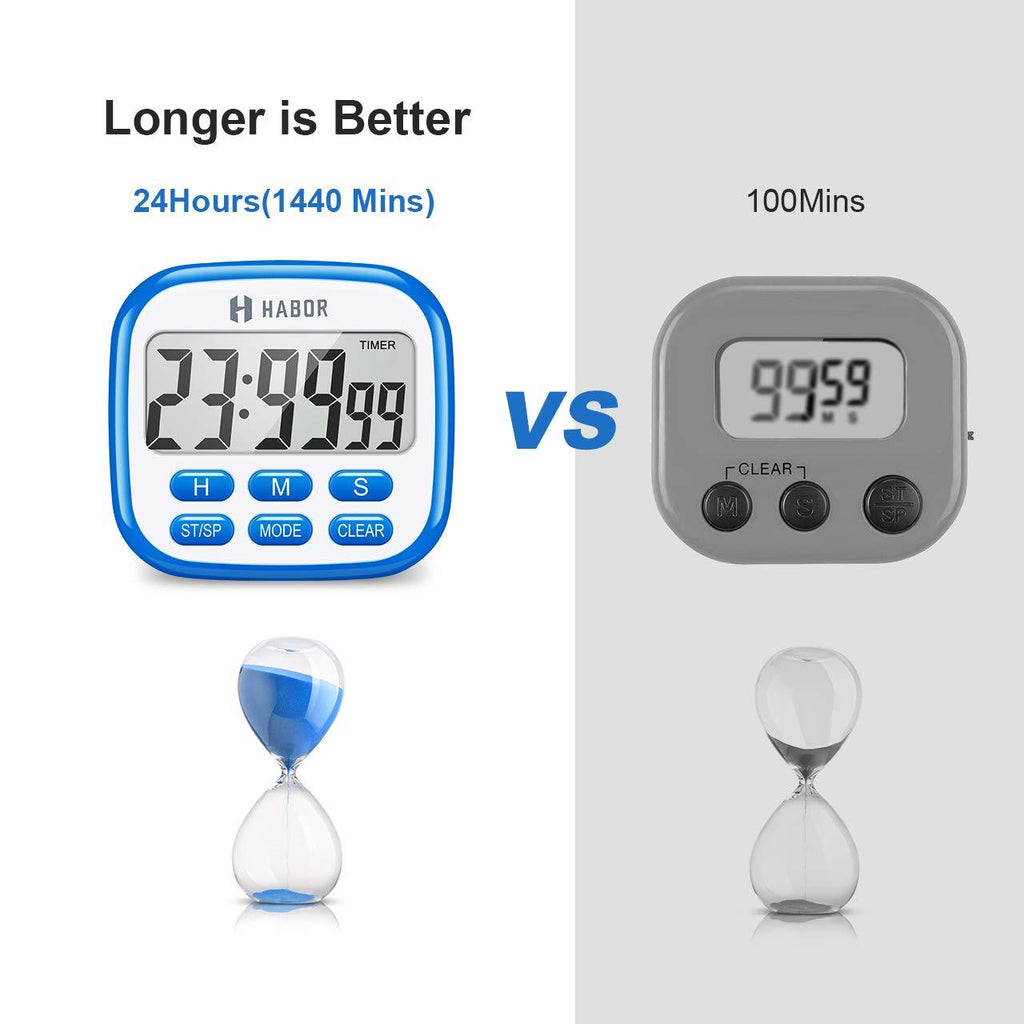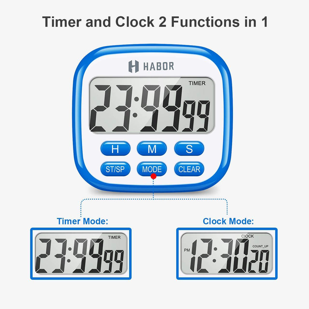 【Simple to Use with Clock Mode】Habor Digital Cooking Timer Clock has two modes (Timer Mode for Count up and down, Clock mode). You can just press the MODE button to change mode. You can also set min/sec/hour individually in operation. 12 Hours time mode changes from AM to PM. (Without ON/OFF button as an Energy-Saving clock).