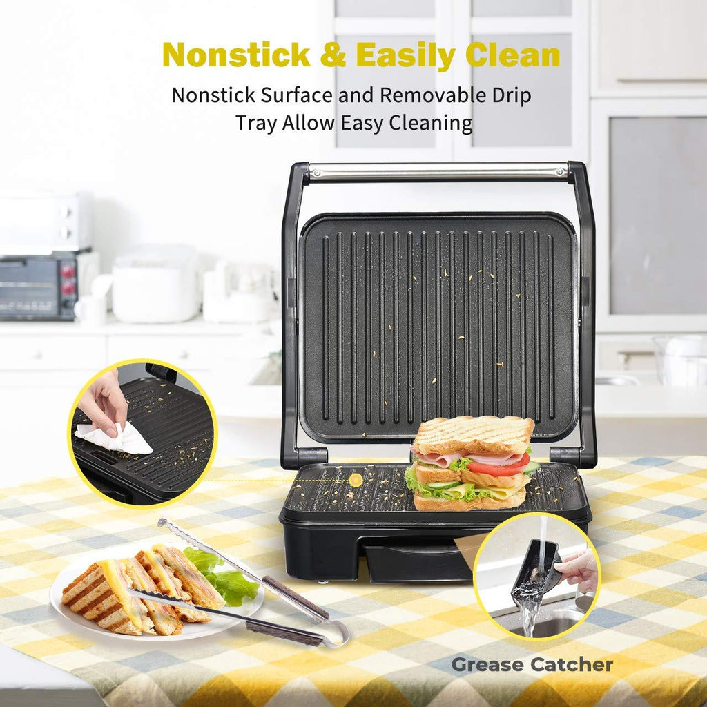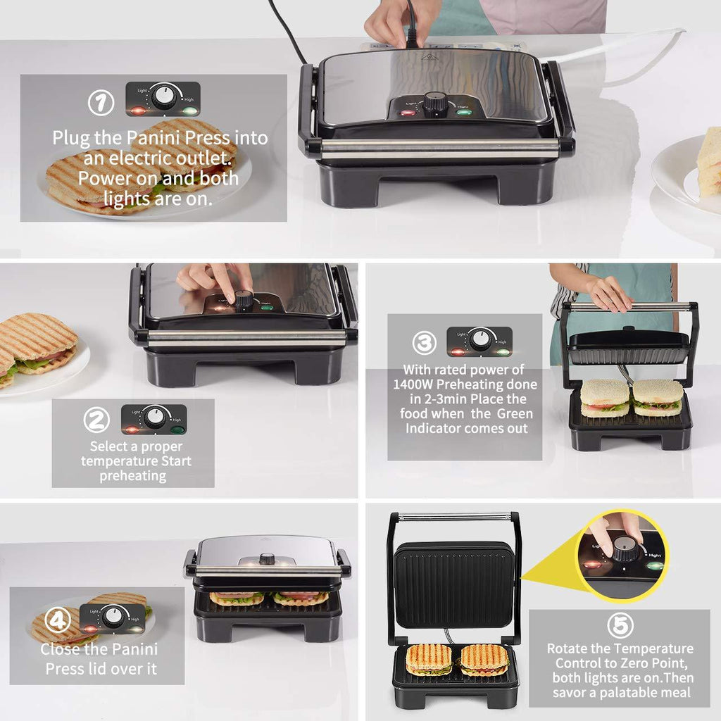 【Safe Panini Maker】With the 2-in-1 shut off switch(control the temperature or turn the grill ON and OFF), stainless steel housing of greatest durability, 2 anti-slip silicone feet underneath, heat-proof handle, as well as an attached oil tray which catches extra grease efficiently, the panini press maker is safe to use.