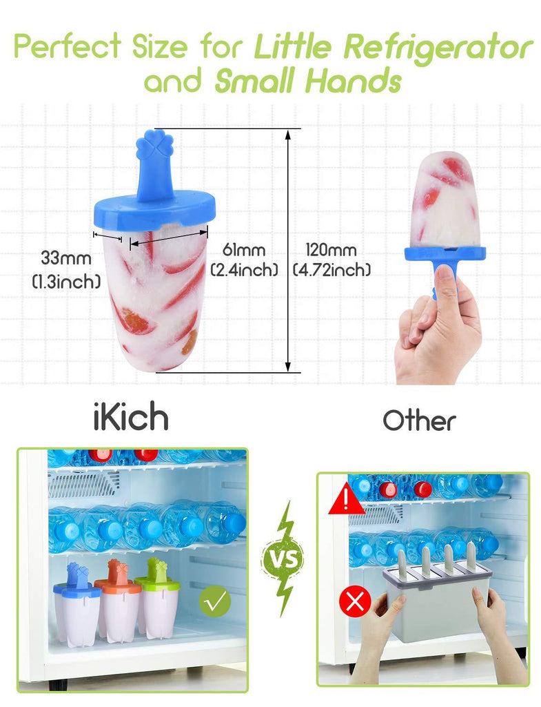 • 【Proper Size & Great Leakproofness】With precise design, each popsicle mold measures 120 x 61 x 33mm. Perfect for any kind of freezer. They are Space-saving. The lid of the popsicle maker prevents water leakage even it is inverted, so as to prevent pollution. Its size is not only perfect for adults, but also for kids. Let IKICH Ice Popsicle Molds make your life more enjoyable.