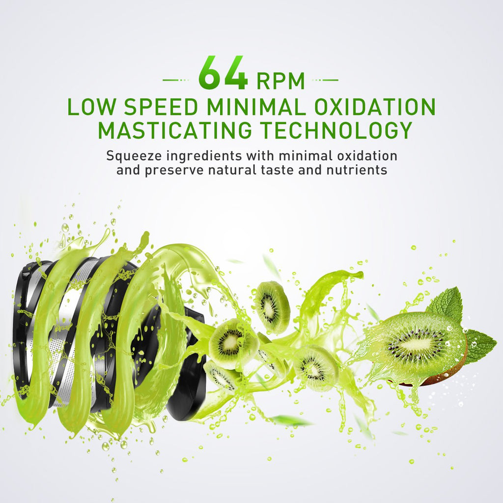 【64RPM Golden Ratio Speed Technology】After testing, the speed of 64RPM keeps the juice with minimal oxidation and best taste , low heat build-up, less foaming and no clogging, remains much more enzymes, vitamins, minerals and trace minerals when use juicer. Take it and be ready to enjoy fresh drinks every day.