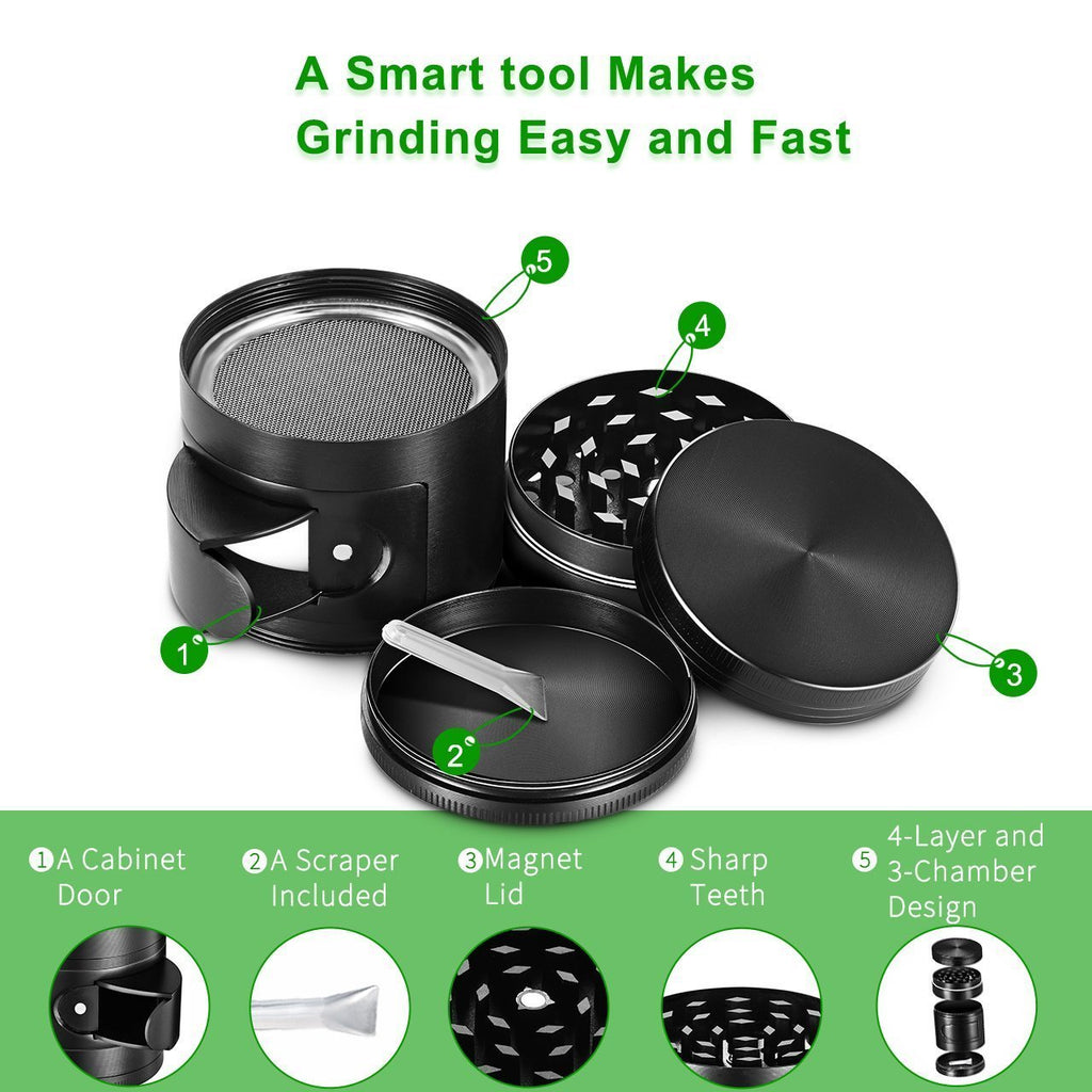 • [Solid and Sturdy Construction] Crafted with premium zinc alloy, this 4-layer and 3-chamber designed herb grinder ensures optimal performance and exceptional durability for constant use.