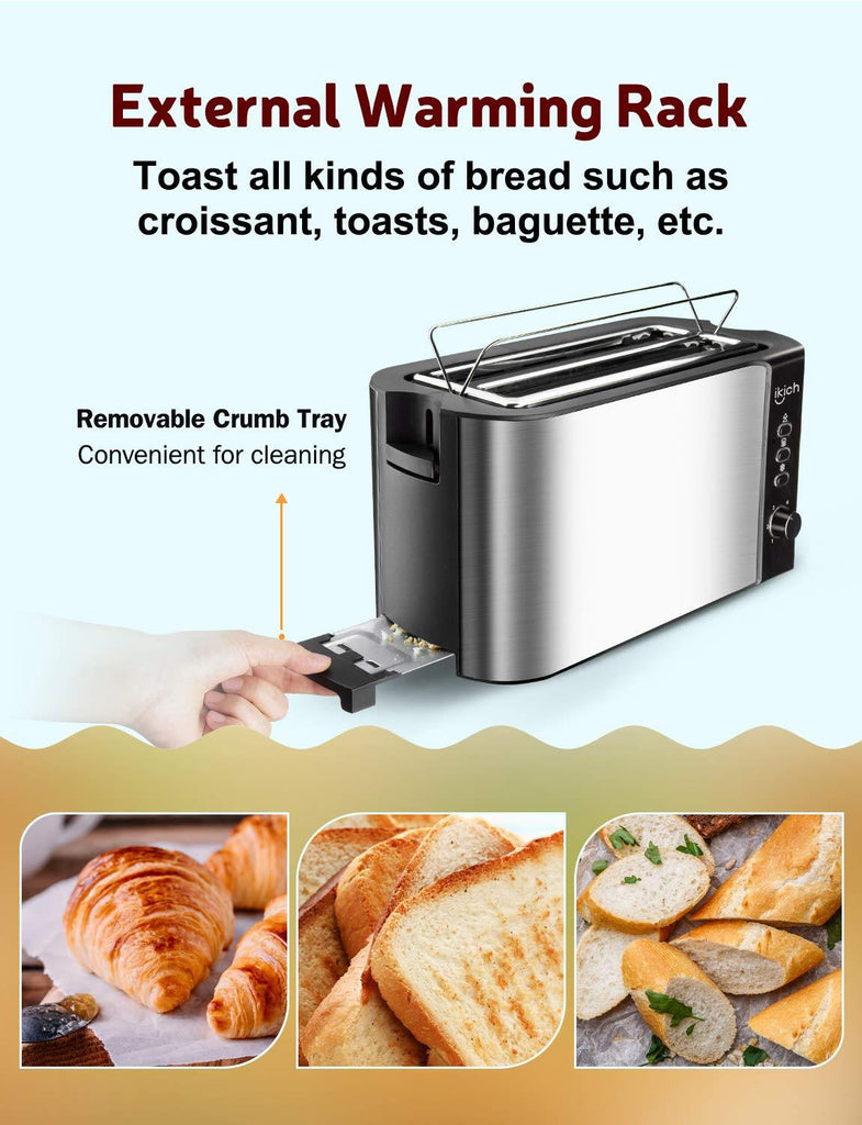• 【Heating Rolls & Croissants with ★ Longer Build-in Warming Rack★】 This stainless steel toaster Keeps Toasted Bread Always Warm. Just push down the back lift lever, the warming rack pops up for you to reheat any pastry conveniently or heat rolls and croissants.
