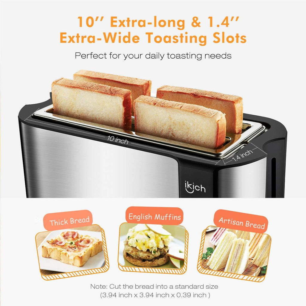 • 【Extra Wide Toaster】 Less time & money spent, 2 Extra wide 1.5" and long 10" slots to accommodate up to 4 slices of bread, or all shapes of specialty breads, which saves your time and gives you a perfect toasting experience; heating wire on both sides of each slot toasts bread evenly and fast.